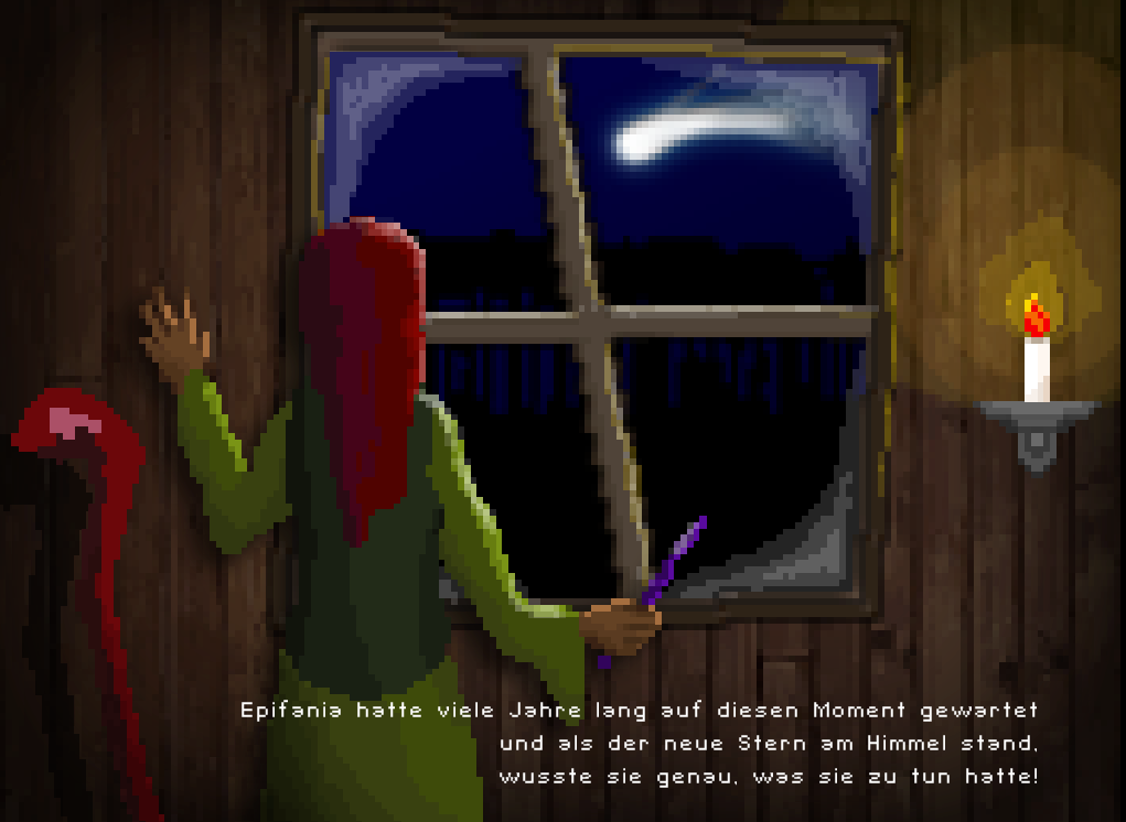 Sie suchte am Himmel nach dem Stern – aber er war verschwunden. Sie rief: „Wo bist du, Stern? Zeig mir den Weg!“ Doch die Nacht blieb dunkel. So lief sie von Dorf zu Dorf, von Haus zu Haus, doch sie fand das Kind nicht mehr.